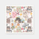 This delightful design is a whimsical collage of cute cartoon characters and objects features a recurring motif of adorable animals, including cats of various breeds and colours, a playful dinosaur, and small, fluffy birds. A charming anime-style girl with dark hair is prominently featured, looking sweetly down at a pudding dessert. The overall style is soft and pastel, with a kawaii (cute) feel.