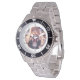 Has heft and feel of expensive stainless steel quartz watches. Good band with safety catch. I removed links, which is easy because engraved arrows show direction to push the linking pins. As always by this seller, the image (a railroad logo) is a perfect reproduction of my emailed image, and is precisely spaced and aligned.