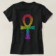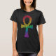 A simple and bold ankh design, with a patern of decorative swirls in rainbow colours.