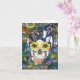 Un gros crâne flanqué de deux oiseaux bleus et jaunes. Des fleurs jaunes autour des yeux. Un squelette aux cheveux verts est sur un côté de l'image.