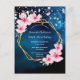 Une floraison tropicale sous les étoiles 50ème anniversaire (ou tout âge) invitation à la fête d'anniversaire avec fleurs d'hibiscus roses, verdure et un cadre géométrique en faux or. Un ciel de nuit bleu foncé avec une pleine lune et étoiles comme arrière - plan. Modèles pour un nom écrit avec un script moderne de style manuscrit, modèles pour vos informations de fête. Texte blanc. Parfait pour un été, une piscine ou une fête de plage ! Retour : carte postale ordinaire. Conseil : Si vous ne voulez pas qu'il ressemble à une carte postale, cliquez sur customiser, allez à l'arrière et retirez le séparateur et le timbre postal.