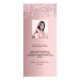Carte menu fête d'anniversaire. Personnalisez et ajoutez un nom, un âge, une date et le menu. Arrière - plan rose vif à l'allure métallique, décoré de faux gouttes de parties scintillant. Lettres de couleur noire. Retour : ajoutez une photo de la fille d'anniversaire, des faits amusants et des noms.
