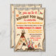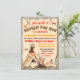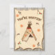 Fête d'anniversaire rustique amérindienne pow wow slepover invitations avec tipi peint à la main, feu de camp et typographie amusante sur un tissu en peau d'animal contre un arrière - plan lambrissé. Idéal pour une fille ou un garçon en sommeil ou une fête de camping. Illustration tirée à la main par McBooboo.