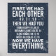 Our unique frameable print is easy to customize with your anniversary and your children's names and birthdates! Modern vintage typography design features the words "First we had each other, then we had you, now we have everything" with spaces for your wedding anniversary and four children's birthdays, on a navy blue background. Have two or three kids? Check our shop for an alternate version.