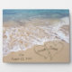Pair of hearts in beach sand with turquoise ocean water and couples' names including wedding date.