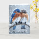 Two Eastern bluebirds with vibrant blue and orange feathers are perched closely together on a snow-covered branch during a gentle snowfall.