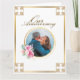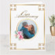 A beautiful round faux gold geometric circle forms a frame around your personal photograph. There is a small floral rose bouquet with green leaves on the left edge and the words, our anniversary, in a faux gold calligraphy style font above. Each corner has a square ornate decorative square with a small cross in it which are linked by gold stripes. The inside has a black template for your personalized message. Ideal for couples celebrating their annual anniversary