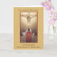 This is a beautiful Priesthood Anniversary card with a souvenir vintage holy card with a priest offering the Mass at the Consecration on the altar in front of Jesus on the Crucifix. A light golden lace background is behind the image. All fonts and texts may be modified.