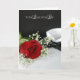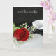 Red rose on a white tuxedo shirt with a black satin bow tie.