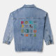 This women's denim jacket has a mix of mid-century modern elements in retro colours, place on a grid. If you like the design but prefer different colours, message me.