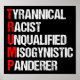 Anti Trump Funny Acronym Poster which features a word poem describing his character: tyrannical, racist, unqualified, misogynistic panderer. Resist this president and continue to support the resistance efforts for equal rights and basic human decency in America. Fight for freedom in our country for all races and genders.