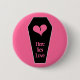 A black coffin with a girly pink broken heart on it, on a hot pink pin on button.