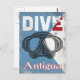 Antigua Caribbean vintage scuba mask travel poster design. A blue and white diver down flag background with a retro scuba mask and word "Dive" at the top.