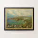Antigua design in Vintage Travel style featuring a tropical island scene with ocean and blue sky.