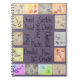 A spiral notebook for the artist in your life. Antique drawings border the notebook like tiles. In the centre are words such as draw, sketch, paint, doodle, imagine, create, ink, charcoal, pen, pencil, and pastel in a fun font.