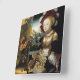 Hanged red yellow grapes with blue ribbon ,grape vines ,red green fall leaves.Beautiful blonde girl with gorgeous dress and gold jewellery with red hat and white feathers and lake landscape in background by German painter Lucas Cranach the Elder 1530 .Classic,elegant vintage style digital collage .with Flemish and Renaissance German paintings,