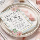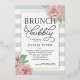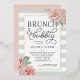 Stylish bridal shower invitation features blush pink watercolor peonies and a sage green striped background with "brunch and bubbly" and your bridal shower details in the centre. Gold foil trim completes the design.