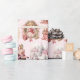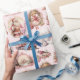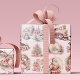 This holiday gift wrapping paper features a delicate seamless pattern design of soft blush pink, ivory, cream, rose and white fussy antique Victorian Era ephemera Christmas themed illustrations from yesteryear, on a faint powder pink background. Graphic depictions include Santa Claus, winter snowscapes, a train, a church, Christmas presents, a decorated xmas tree, a child, a bird, seasonal foliage, festive garlands, elaborate frames, and more.