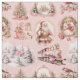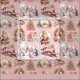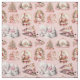 This holiday fabric features a delicate seamless pattern design of soft blush pink, ivory, cream, rose and white fussy antique Victorian Era ephemera Christmas themed illustrations from yesteryear, on a faint powder pink background. Graphic depictions include Santa Claus, winter snowscapes, a train, a church, Christmas presents, a decorated Xmas tree, a child, a bird, seasonal foliage, festive garlands, elaborate frames, and more.