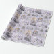This holiday gift wrapping paper features a delicate seamless pattern design of very pale lavender purple, ivory, cream, gold, and white fussy antique Victorian Era ephemera Christmas themed illustrations from yesteryear, on a faint light lilac purple background. Graphic depictions include Santa Claus, winter snowscapes, a train, a church, Christmas presents, a decorated xmas tree, a child, a bird, seasonal foliage, festive garlands, elaborate frames, and more.