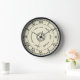 This bold and simple yet classic clock design has a basic black Roman numeral design with a vintage look to it. It has circles and dotted circles, as well as a lined border around it. The background is a light brown-beige with a slight marbled effect added. You can use the easy template to add a circle of text to the centre, or delete the sample text to leave it blank. When you add text, be careful that you don't add too much or it will overlap on the bottom. You can also "customize it" to make any changes you would like. This is a pretty, antique-looking wall clock.