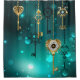 Gold, antique keys with gears and dials hang on gold chains on luminous green background.