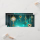 Gold, antique keys with gears and dials hang on gold chains on luminous green background.