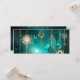 Gold, antique keys with gears and dials hang on gold chains on luminous green background.
