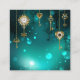 Gold, antique keys with gears and dials hang on gold chains on luminous green background.