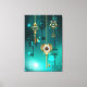 Gold, antique keys with gears and dials hang on gold chains on luminous green background.