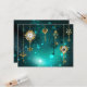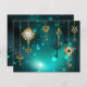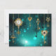 Gold, antique keys with gears and dials hang on gold chains on luminous green background.