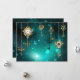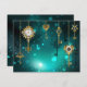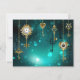Gold, antique keys with gears and dials hang on gold chains on luminous green background.