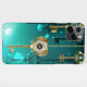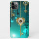 Gold, antique keys with gears and dials hang on gold chains on luminous green background.
