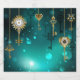 Gold, antique keys with gears and dials hang on gold chains on luminous green background.