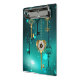 Gold, antique keys with gears and dials hang on gold chains on luminous green background.
