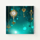 Gold, antique keys with gears and dials hang on gold chains on luminous green background.