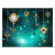 Gold, antique keys with gears and dials hang on gold chains on luminous green background.