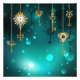 Gold, antique keys with gears and dials hang on gold chains on luminous green background.
