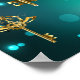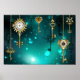 Gold, antique keys with gears and dials hang on gold chains on luminous green background.