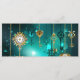 Gold, antique keys with gears and dials hang on gold chains on luminous green background.