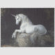 An antique-style painting of a unicorn resting gracefully on a rock, evoking mythical elegance and timeless fantasy charm.