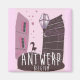 Antwerp, Belgium holiday travel poster cartoon of a cat walking down a old cobbled street or lane.