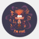 This illustration captures "Anxiety," a character from the Disney/Pixar movie "Inside Out 2," amidst a tempest of worry and panic. Dark, swirling shapes and jagged lines envelop the character, symbolizing the overwhelming nature of anxiety. The character's fiery red hair and wide, fearful eyes emphasize their distress, while their nervous smile and tightly clasped hands betray a struggle to appear calm. The phrase "I'm fine" poignantly contrasts with the intense emotions depicted, shedding light on the often hidden struggles with mental health.