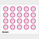 Pretty birthday stickers. Pink flamingo standing on one leg, inside a white circle with a black edge, surrounded by purple and blue stars. The background is a hot pink colour. Above is a template to add your age and below a template to add your name.