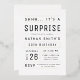 Modern fun adult surprise birthday invitation feature minimalist typography with real gold foil lines and black and white party details, simple and clean, great for 21st, 30th, 40th, 50th, 60th, 70th, 80th, 90th or any other age simple birthday party, surprise party, or any other occasion! Custom it with your own text and party information.