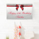 Pretty red and silver any age personalized birthday banner with a flat graphic image of silver sequins and red bow with red text.