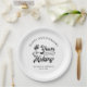 Celebrate any year wedding anniversary with these black and white party plates featuring a retro calligraphy script typography title design # YEARS IN THE MAKING that incorporates how many years they've been married (i.e., 50 YEARS IN THE MAKING) and their wedding year within the design, the editable title HAPPY ANNIVERSARY and personalized with names and date or other custom text. Contact the designer via Zazzle Chat or makeitaboutyoustore@gmail.com if you'd like this design modified, in another colour,on another product or would like coordinating items.