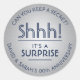 Add an elegant personalized touch to surprise 25th silver anniversary party invitations, decorations, and favours with these modern navy blue stickers / envelope seals. Design features a faux metallic brushed stainless steel background and trendy vintage art deco inspired typography with customizable message that reads "Shhh! It's a SURPRISE." As an option, the stylish curved typography can be a name and address for use as chic modern round return address labels.