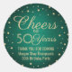 Add a personalized finishing touch to birthday party thank you notes or favors with these green and gold round stickers / envelope seals. This template is set up for a 50th birthday, but is simple to customize to another year or event, such as an anniversary. Design features foil look confetti dots on a green faux brushed stainless steel background, stylish script calligraphy "Cheers to 50 years," and modern minimalist typography editable message at bottom. Please note that gold is printed color, not metallic foil.