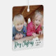 Celebrate the simple joys of the holidays with a custom 2 photo overlay square metal ornament. Pictures and all text on this template are easy to customize and can be different or the same on front and back. It can include any wording, such as Merry Christmas, Happy Holidays, Best Friends, kids & family names, etc. (IMAGE PLACEMENT TIP: An easy way to position a photo exactly how you want is to crop it before uploading to the Zazzle website.) The festive green, white and black and design features chic trendy brushed script calligraphy, simple modern minimalist typography names & year, and two photos of your choice. This unique keepsake adds a stylish touch to Xmas home decorations. Merry Christmas!